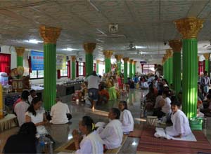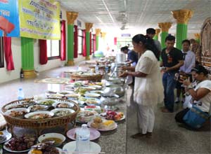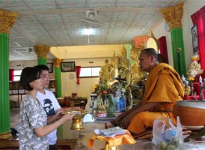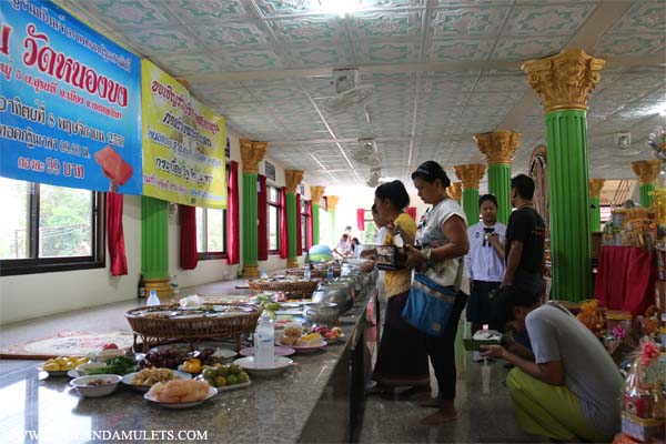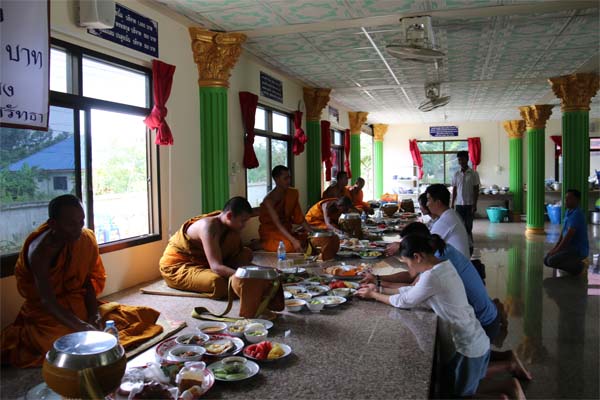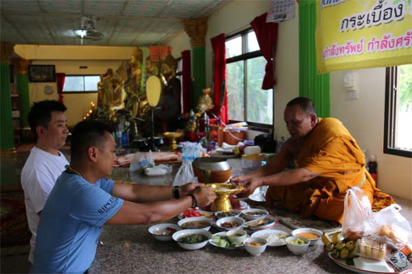 Offering foods to monks and donation to build big Buddha statue at temple.