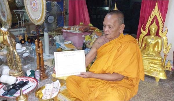 Buddha PhraLeeLa amulet made given to visitors. Altar to pay respect to the Queen.