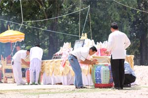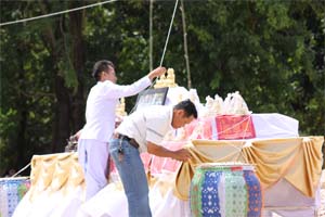 Blessing holy water and flowers after bless/chanted mantras.
