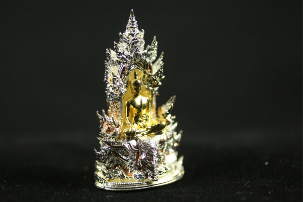Buddha PhraGring is the holy bell Buddha. "Gring" which mean bell in Thai, when shake the sound echoes to all realms. To grant prayer's wishes. To welcome good health to prayer's fortune. 3 Kings style Gold, Silver, Copper. Genuine temple stamp codes at bottom of the amulet.