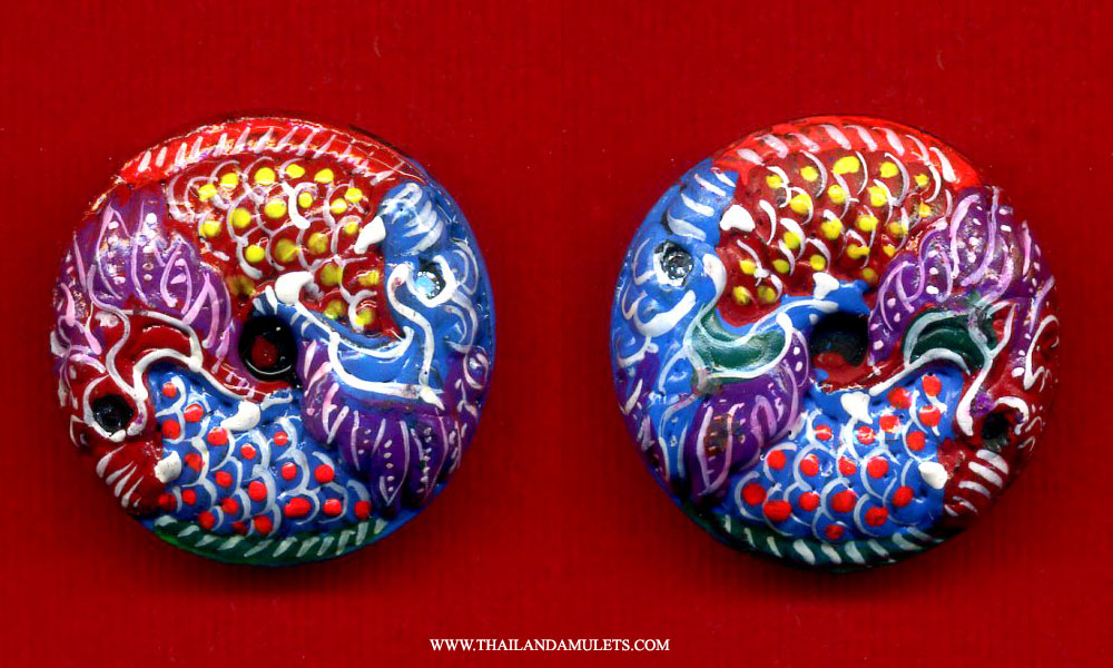 This round-shaped amulet is crafted from sacred holy powders and beautifully hand-painted on both sides. The imagery depicts the Fish Kings (Phaya Matcha ReakSab), calling in abundance and prosperity. The colors are vivid and symbolic, while the form is delicately detailed, making each piece both a sacred object and a work of art. The amulet also carries a natural fragrance from the blessed powders used in its making.