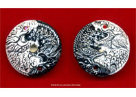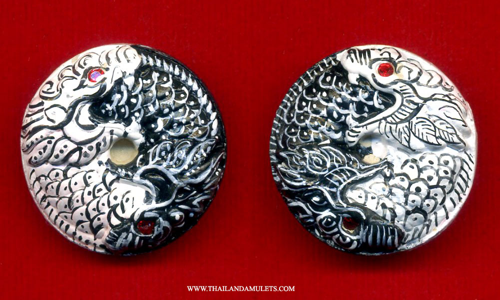 This round-shaped amulet is crafted from sacred holy powders and beautifully hand-painted on both sides. The imagery depicts the Fish Kings (Phaya Matcha ReakSab), calling in abundance and prosperity. The colors are vivid and symbolic, while the form is delicately detailed, making each piece both a sacred object and a work of art. The amulet also carries a natural fragrance from the blessed powders used in its making.
