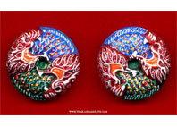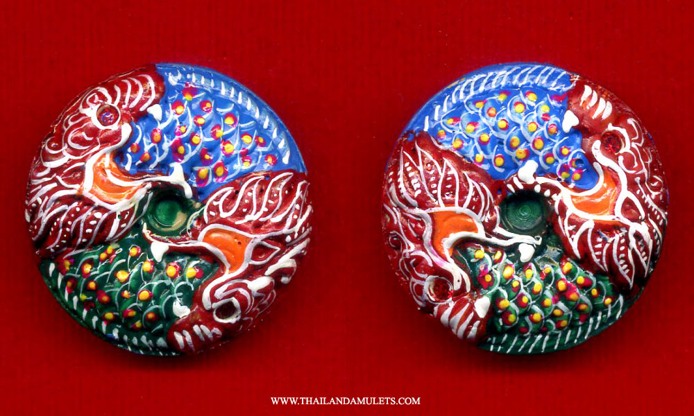 This round-shaped amulet is crafted from sacred holy powders and beautifully hand-painted on both sides. The imagery depicts the Fish Kings (Phaya Matcha ReakSab), calling in abundance and prosperity. The colors are vivid and symbolic, while the form is delicately detailed, making each piece both a sacred object and a work of art. The amulet also carries a natural fragrance from the blessed powders used in its making.