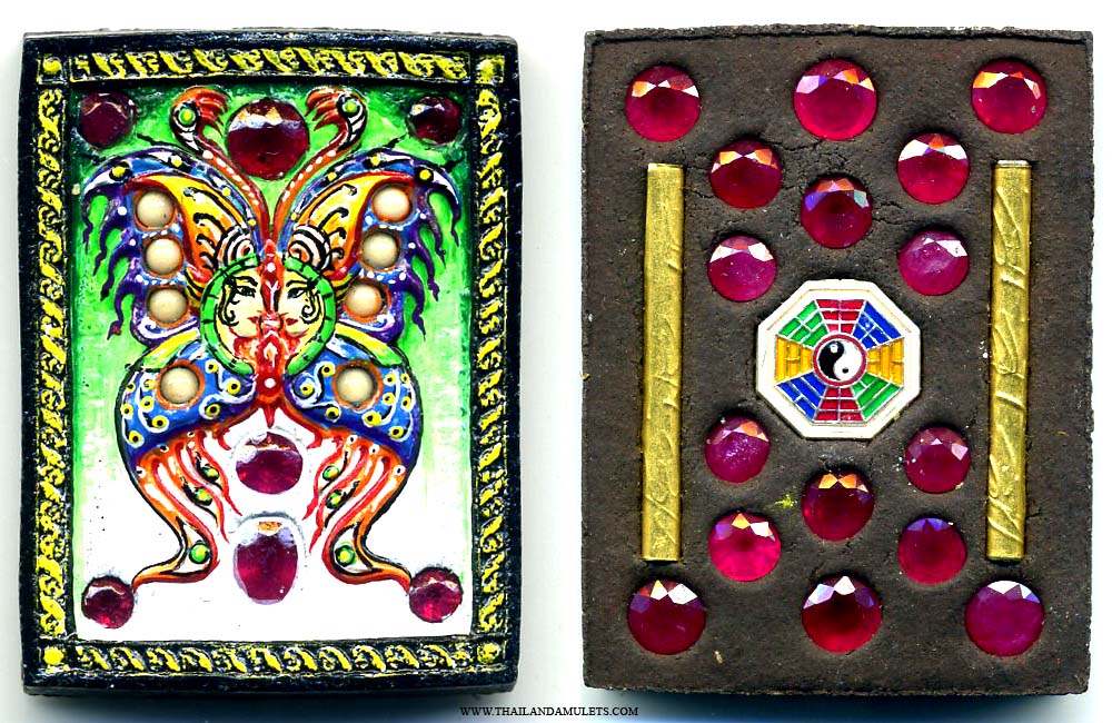 Original type King of Butterfly with 2 Gold trakruts attached, each wrote yans spells letters by Kruba Krissana, attached with high quality gems. Center attached with chinese yans pad gor yin/yang protect from all direction, chanted and crafted mantra then attached by Kruba Krissana.