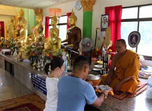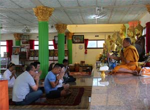 Offering foods to monks and donation to build big Buddha statue at temple.