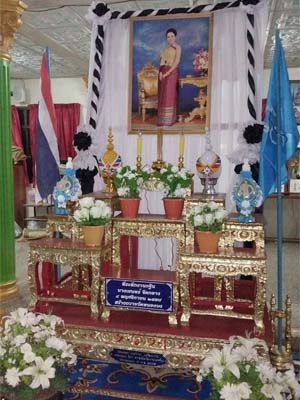 Buddha PhraLeeLa amulet made given to visitors. Altar to pay respect to the Queen.