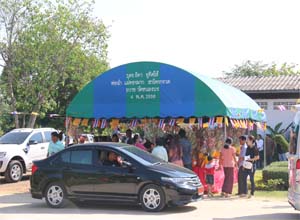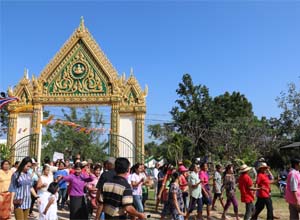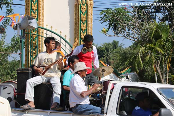 Gatin parade to the temple with musical band, people dancing.
