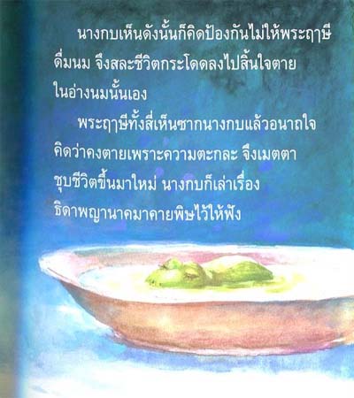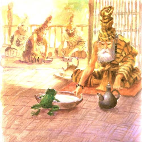 A female frog alway grateful to hermits. She then sacrifice herself by jump into a milk bowl to prevent others to drink it. When great hermits see this, which first thought of her gluttonous. With compassion they revive a flog. A flog then tell them the truth.