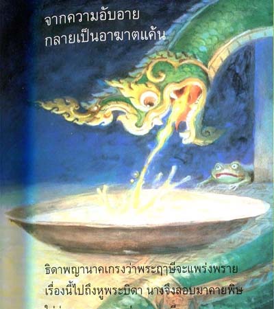 Naga princess fear that hermits will tell her father, she sneak into hermit's hut and spill a deadly poison over their milk in purpose to kill them. But a frog saw it.