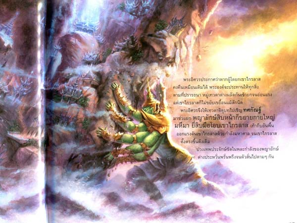 Shiva then order Jituboh deva to invite Tossagun to help. Tossagun enlarge his body, lift it by his giant power with 20 arms, push Krailas montain back to it was once before.