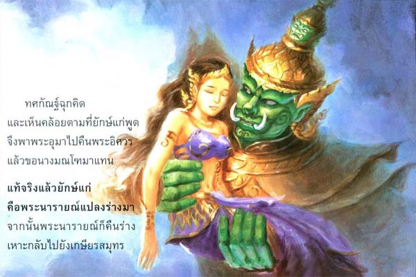 Tossagun fall for an old giant's words, he took Umatevi back and take Montoh instead. Truth is that old giant is PhraNarai transformed, then he return to his realm.