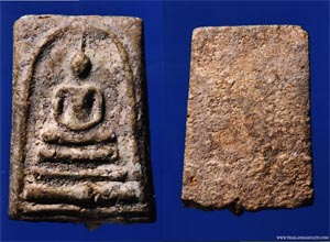 Some of Phra Somdej amulets nowaday that we can see, they've been Lhong Ruk(black) - Pid Thong(gold). Some have been washed and some stay the same since create. In my opinion, i understand that Pid Thong to put gold skin is for mongkon(bless/auspicious) by buddha, same at when we visit any temple and we Pid Thong at Lord Buddha's statue for good karma and tradition. Amulets which have been Lhong Ruk - Pid Thong will keep amulets surface skin protect. Once wash away Ruk-Thong, the amulets skin will "Tak Lai Ngar" or "Lai Sunkalok"(2 types of shattered skin) no acception. Reason because at the front side of amulets not balance with image and frame make low/high line. When "Ruk" is dry, they will tight the surface skin which make them break/shatter. Note : only the front side only, For "Lai Sunkalok" can be for acception for 2-3 lines at most. *The amulet show above is Pim Sendai, the backside is incredibly beautiful with the Pu-Tai crab's foot prints show all over the amulet.