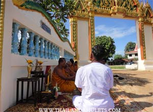Monks chanting blessing and dana to dedicate good merit outside at temple gate. This is to welcome good spirits/deva and Buddha statues to temple.