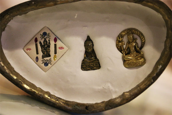 At bottom of the statue. Attached with King of Butterfly amulet with PhraPhrom(Brahma) amulet, 2 silver takruts by Kruba Krissana Intawanno, abbot of WatWeruwan temple. PhraAuppakutt amulet by Luangpu Hong Prompunyo, abbot of WatPetchburi temple. PhraShiva amulet by Luangpor Teang Puripunyo, abbot of WatNongphong temple.