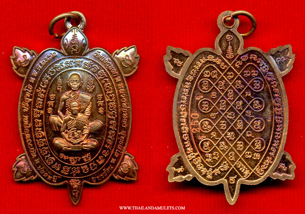 Great Turtle mantra amulet batch "Plodnee"(Free debt). Front side, image of Luangpor Koon and Luangpor Tong meditation blessing, surround with yant blessing mantras, back side, yant blessing mantra and temple stamp code.