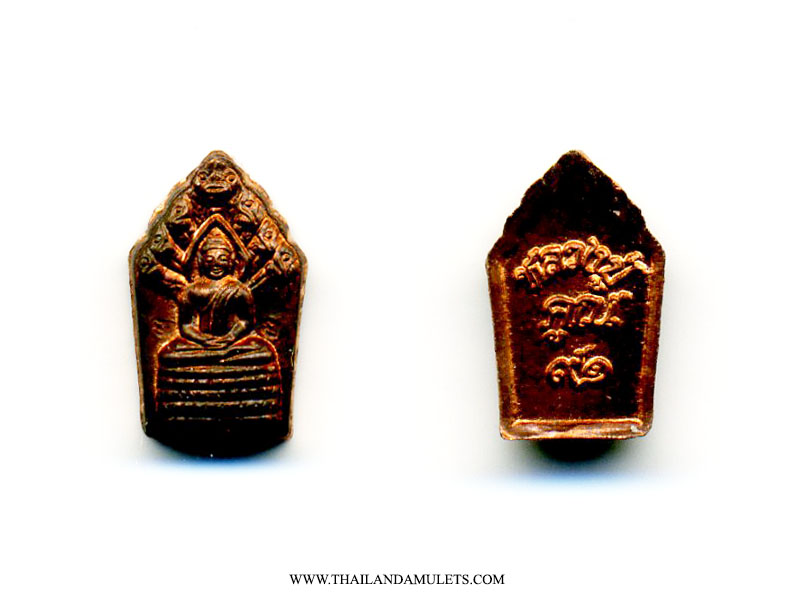 Made of copper. Small size amulet. Front side, Buddha Narkprok(Naga) blessing with 2 stamp codes by temple. Back side, "Luangpu Koon 91".