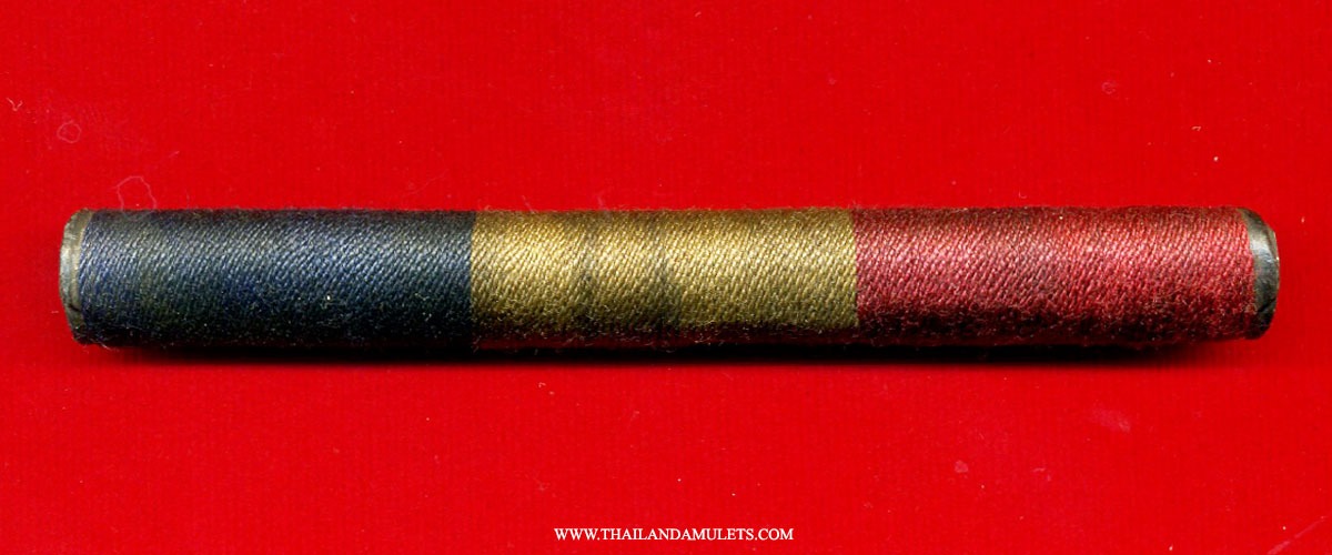Until years 2511-2512. The third time Luangpor Tob decided to made flag takruts again. This time come into several size to give to soldiers during wars within the country at "Rhongkar" and "Kao Kor". Many soldiers returns for this blessing, ordain later with the monk. Takrut Thongchard is unique. Filled with 3 colours. Red is bloods of people. White is the purity of Buddhist's religion. And Blue is the honor of noble, the King. Luangpor Tob made mahaautt mantras famous with his powerful blessing takruts.