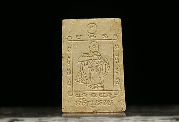 Front side, Buddha Parng-Samathi(Meditation blessing pose). Buddha PhraSomdej PimKatebuatoom(A head of blooming lotus) mould type with a crescent moon ear shape, a clear line of Sangkathi monk's robe. Back side, Luangpor Koon chanting, holding rosary blessing, surrounds with yant blessing mantras. Round shape with word "Koon" on top. "Wat Boon" temple at bottom.