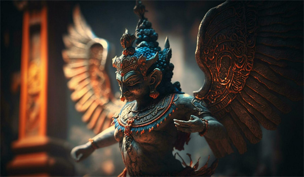 Garuda is generally portrayed as a protector with the power to swiiftly travel anywhere, ever vigilant and an enemy of every surpent. He is also known as Tarkshya and Vainateya.