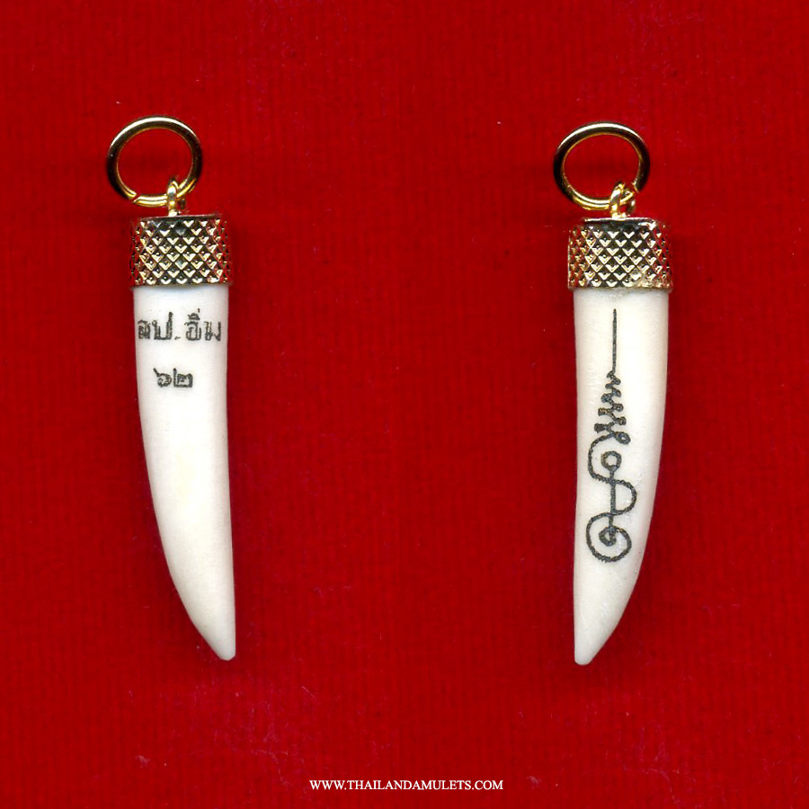 Tiger Fang is one famous amulet type since old times. Made from various part of strong creatures. This is use for protection. Strong spirit blessing. Ward off evils/darkness, curses and sickness. Tiger is considered a powerful creature and spirit. Same with elephant. The amulet is made of Elephant's bone ex. Head(Skull), Body(Spine/Ribs), Hibs, Legs. Stamp "Yant" blessing mantra by the monk and temple stamp code.