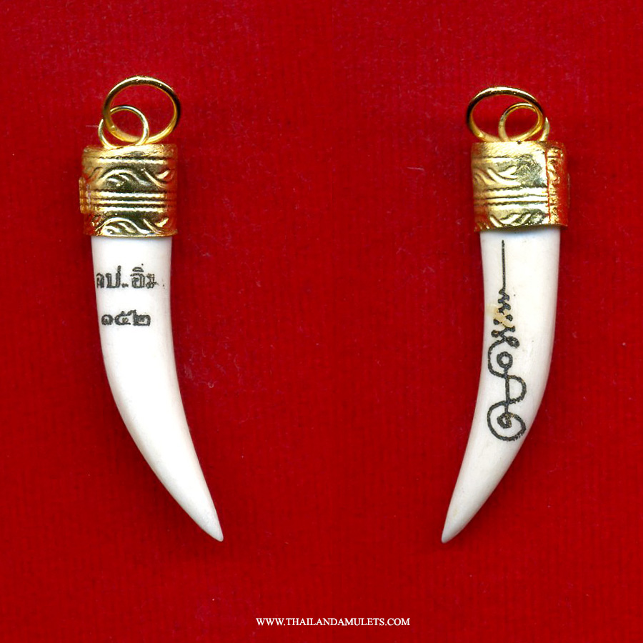 Tiger Fang is one famous amulet type since old times. Made from various part of strong creatures. This is use for protection. Strong spirit blessing. Ward off evils/darkness, curses and sickness. Tiger is considered a powerful creature and spirit. Same with elephant. The amulet is made of Elephant's bone ex. Head(Skull), Body(Spine/Ribs), Hibs, Legs. Stamp "Yant" blessing mantra by the monk and temple stamp code.