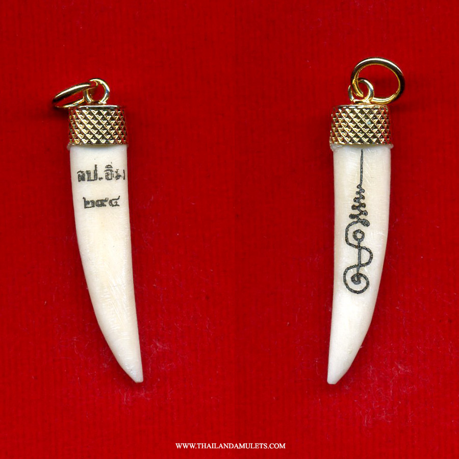 Tiger Fang is one famous amulet type since old times. Made from various part of strong creatures. This is use for protection. Strong spirit blessing. Ward off evils/darkness, curses and sickness. Tiger is considered a powerful creature and spirit. Same with elephant. The amulet is made of Elephant's bone ex. Head(Skull), Body(Spine/Ribs), Hibs, Legs. Stamp "Yant" blessing mantra by the monk and temple stamp code.