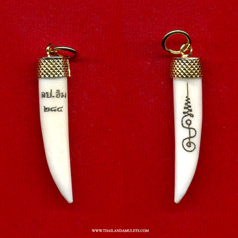 Tiger Fang is one famous amulet type since old times. Made from various part of strong creatures. This is use for protection. Strong spirit blessing. Ward off evils/darkness, curses and sickness. Tiger is considered a powerful creature and spirit. Same with elephant. The amulet is made of Elephant's bone ex. Head(Skull), Body(Spine/Ribs), Hibs, Legs. Stamp "Yant" blessing mantra by the monk and temple stamp code.