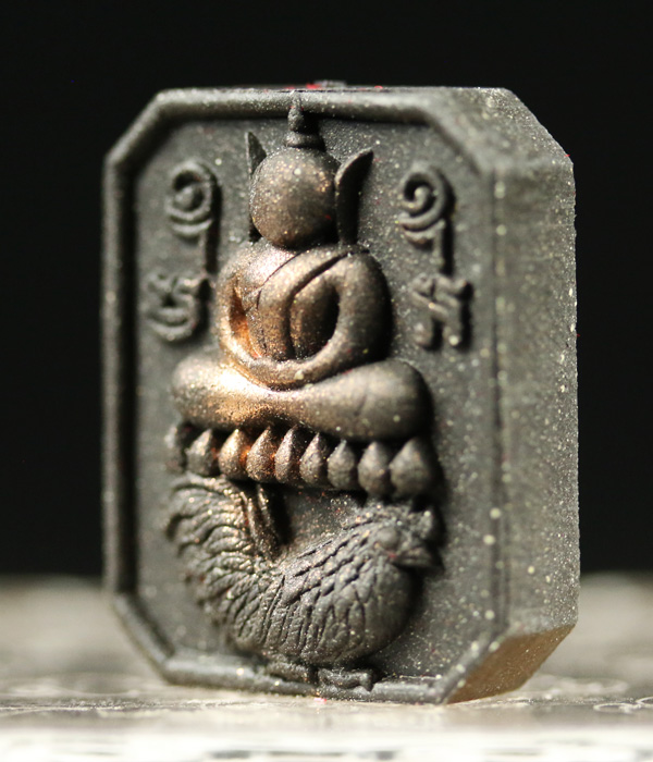 Made of sacred holy powder. Buddha riding cock amulet made famous by Luangpor Parn, guru monk of Thailand. The meaning of the cock is bravery, courage, and to bring unlimited supply into fortune fast. Famous mold type, made by many guru monks until present day.