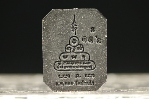 Front side, Buddha meditation blessing, side with mantras, riding cock at the base. Back side, yant blessing mantra, batch and ceremony details, attached with protection takrut.