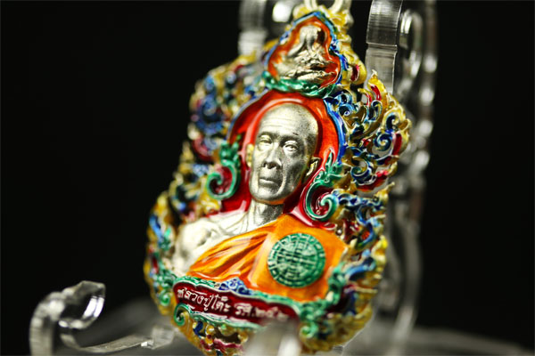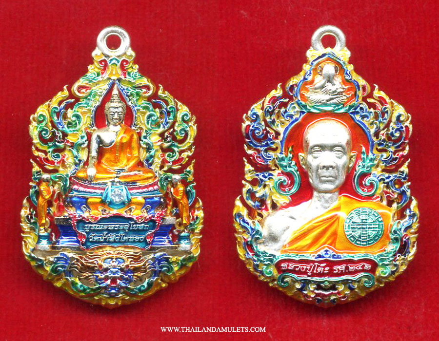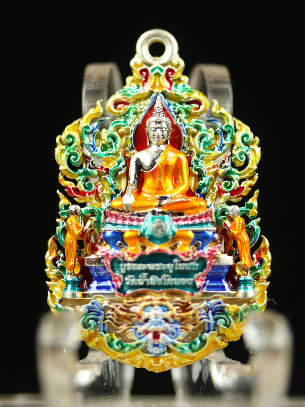 Front side, the Buddha Chinnarath blessing, lhong-yar enamel art work of Sukhothai era. Praying by side by two great disciple Moakalana and Sariputra. Words by the base "Burana Ubosod Wat Tumsingtohthong" in purpose to gain donation to renovate ordination of the temple. Lion at the bottom. Back side, guru monk Luangpu Toh of Wat Pradoochimplee blessing. Phra Sangkajai Pidda (Closing eyes) on top.