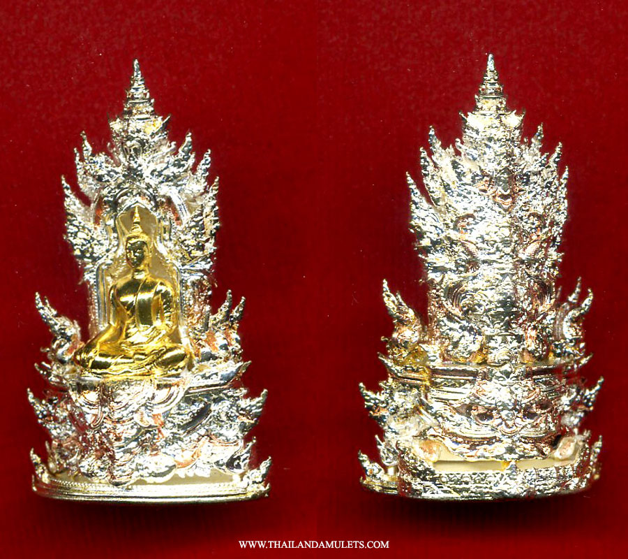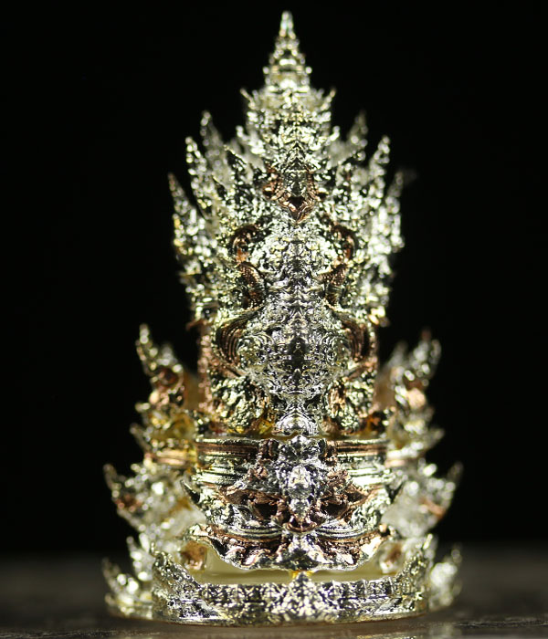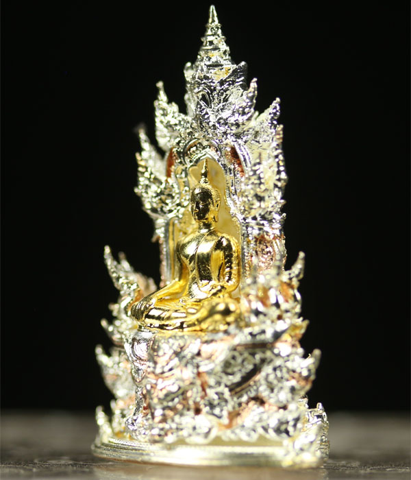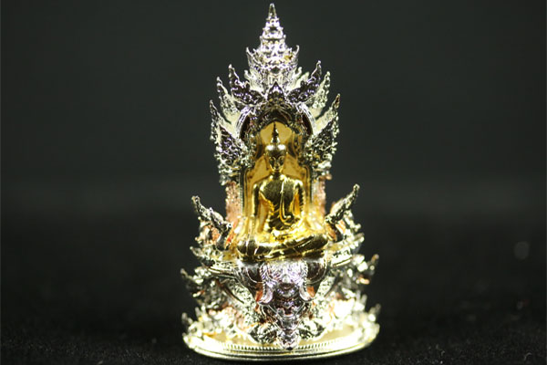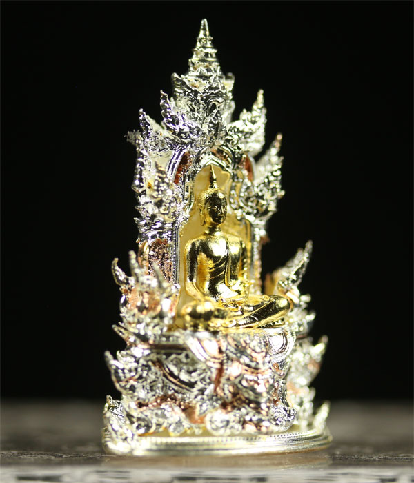 Buddha PhraGring is the holy bell Buddha. "Gring" which mean bell in Thai, when shake the sound echoes to all realms. To grant prayer's wishes. To welcome good health to prayer's fortune. 3 Kings style Gold, Silver, Copper. Genuine temple stamp codes at bottom of the amulet.