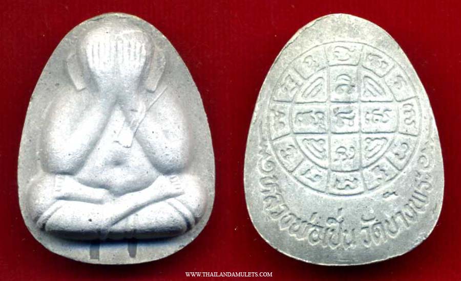 Powerful blessing PhraPidda amulet by Luangpor Pern ceremony at WatBarngphra b.e.2537(a.d.1994), batch "Romyen"(Peaceful), PhraPidda bless/chanted by Luangpor Pern blessing strong protection fortune, bring peaceful into family and people around, attached with 2 silver trakruts for protection, backside wheel of fortune filled by yans mantras by Luangpor Pern to bring good fortune.