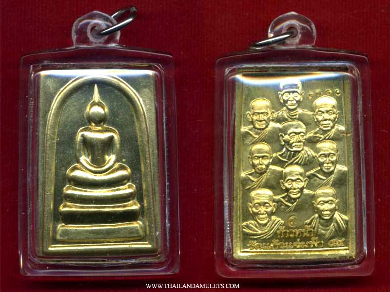 Description PhraSomdej Buddha amulet with 9 guru monks image.