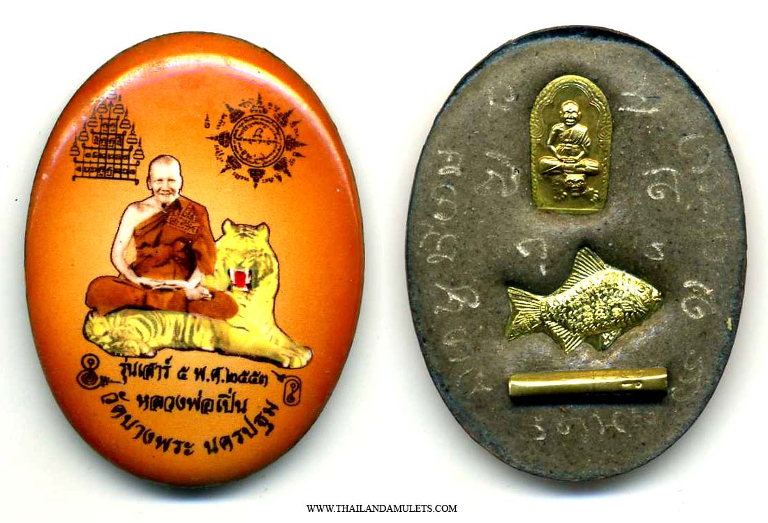 Frontside, Luangpor Pern riding tiger, meditation blessing pose, top sides with yants blessin gmantra, buttom word "Batch SaoHar 5 May B.E.2553"ceremony details "Luangpor Pern". Backside, wrote with yant blessing mantra, sacred holy powders materials consecrated powerful, golden carp big fish to bless great fortune for life is a flow of river, takrut mantra plate craft with yant(spell letters) for protection. One good blessing locket amulet.