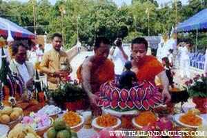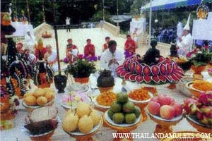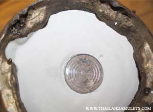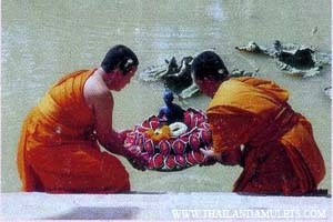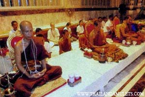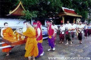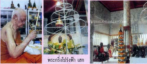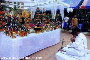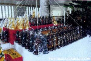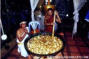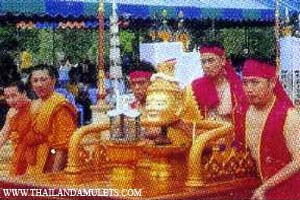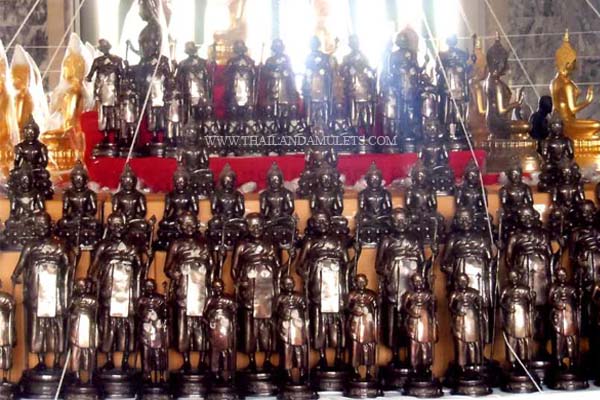 Luangpu Hong yean kwak-mer reaksab(Luangpu Hong standing waving welcome wealth fortune) statue bless/chanted ceremony B.E.2555(2012), lead ceremony and light victory candle by Luangpu Hong, abbot of WatPetchburi temple, with many monks joined the ceremony. Sacred holy powders attached at buttom.