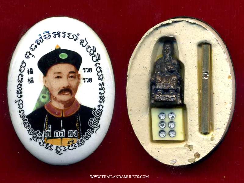 Frontside, image of Er Ger Fong blessing surround with yant blessing mantras, made with red holy powder. Backside, attached with silver takrut craft with yant for protection, rooblor worship mini statue of Er Ger Fong and dice blessing good wealth luck fortune to wearer.