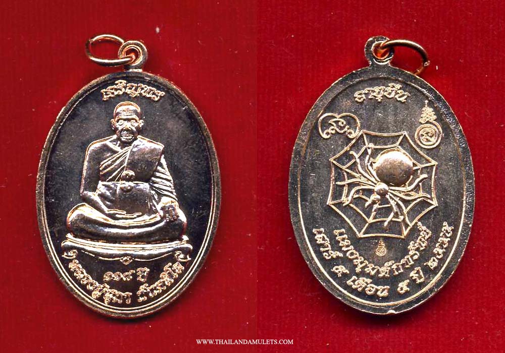 Frontside, Luangpu Supar meditation pose of Parng-chanamarn(victory from evils/darkness) pose blessing, word on top "Jarernporn"(blessing), buttom word "118 years Luangpu Supar Guntasilo". Backside image of Mangmoom Daksub, wealth spider mantra, one famous blessing mantra by Luangpu Supar passed down drom guru monk Luangpu Sook of WatPakrongmakamtao, batch and ceremony details.