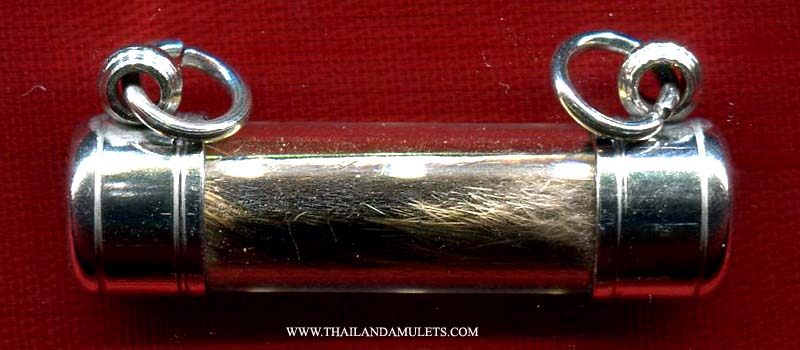 Trakrut is one famous holy item for strong protection fortune, protect from dangers misfortune, all harms. Both men/women used, ex soldiers/policemen or any normal working people which need protection blessing to their fortune. Wrote with yans mantra spells at the back side of Tiger's skin, chanted then roll to kept the power within, attached with Luangpor Pern's mantra takrut on top. Famous and powerful holy item for protection fortune from WatBarngphra.