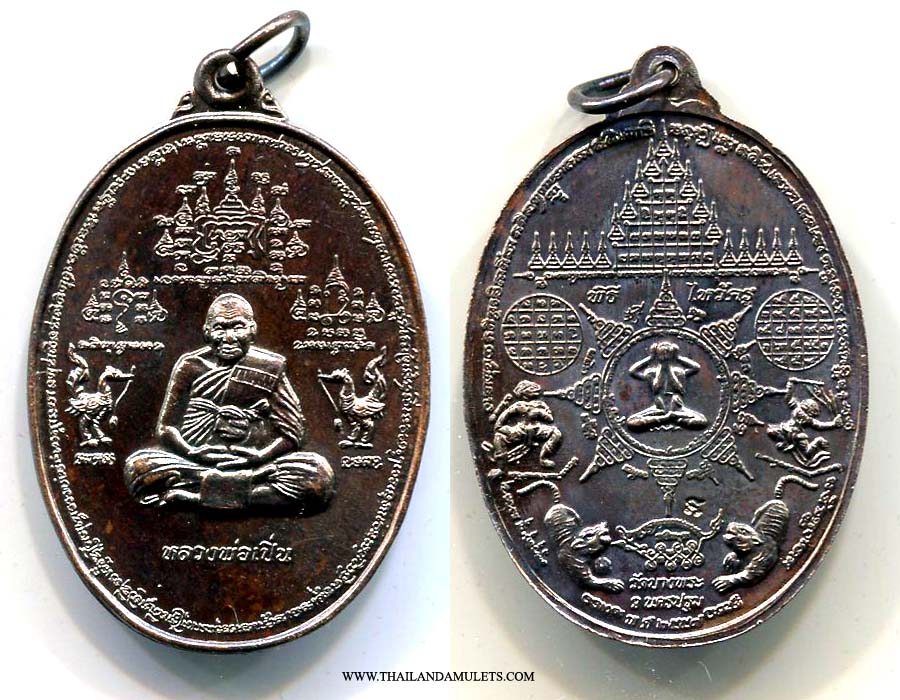 Frontside, Luangpor Pern meditation blessing surround with great mantra. Backside PhraSangkajai mahaautt, protect from all direction, Yant 9 Yods(9 spires mantras) on top, side with many great yants blessing mantras. Hanuman gods and tiger, batch and ceremony details. Beautiful high quality monk amulet.