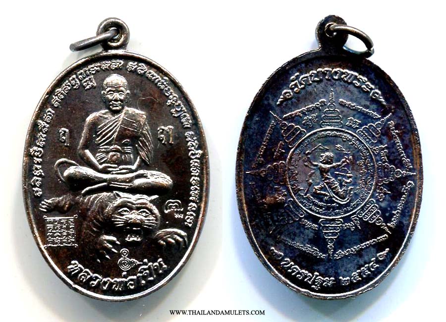Frontside, Luangpor Pern riding tiger, meditation blessing, surround with yants blessing mantras. Backside Hanuman blessing victory and protection surround with yants mantras. Batch and ceremony details.