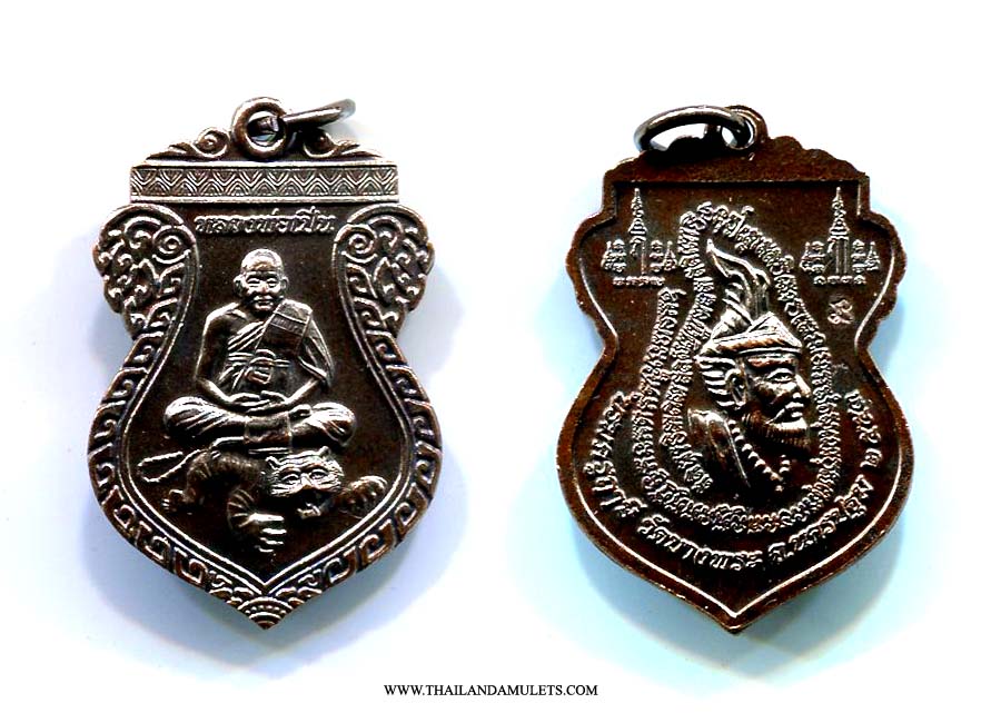 Luangpor Pern's rean Sema Nangser Metta-Mahabaramee, Luangpor Pern riding tiger, kindness with great karma, consecrated from WatBangphra temple, ceremony B.E.2553(a.d.2010). Rean Sema is a shape of Boh's tree leaf amulet, a tree which Buddha reached enlightenment.