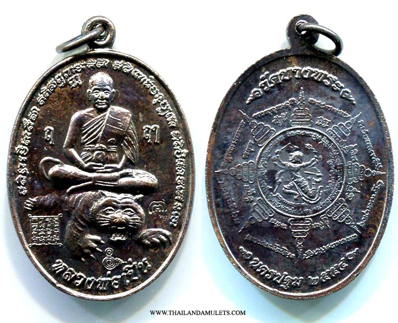 Frontside, Luangpor Pern riding tiger, meditation blessing, surround with yants blessing mantras. Backside Hanuman blessing victory and protection surround with yants mantras. Batch and ceremony details.