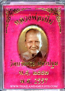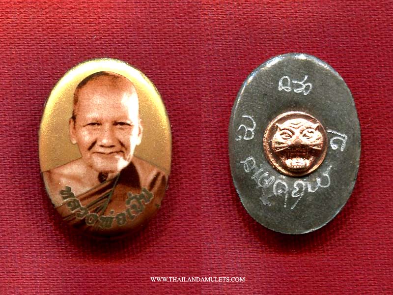 Luangpor Pern's locket amulet, golden colour. Bless/chanted ceremony b.e.2557(a.d.2014) at WatBangphra temple. Monk amulet wear for protection and welcome good fortune, image of holy monk blessing front side, backside attached with tiger amulet, wrote with yant mantras, made of sacred holy materials, consecrated from WatBangphra.