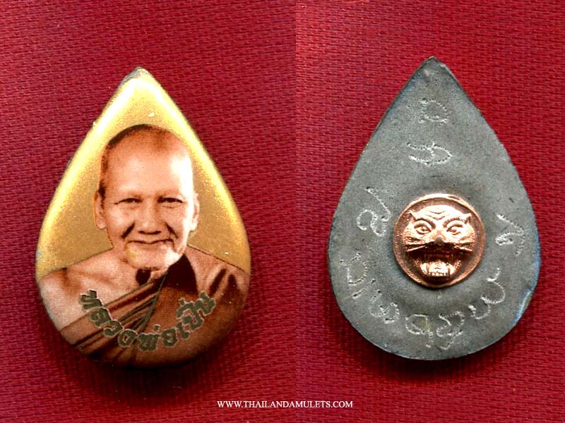 Luangpor Pern's locket amulet, golden colour. Bless/chanted ceremony b.e.2557(a.d.2014) at WatBangphra temple. Monk amulet wear for protection and welcome good fortune, image of holy monk blessing front side, backside attached with tiger amulet, wrote with yant mantras, made of sacred holy materials, consecrated from WatBangphra.