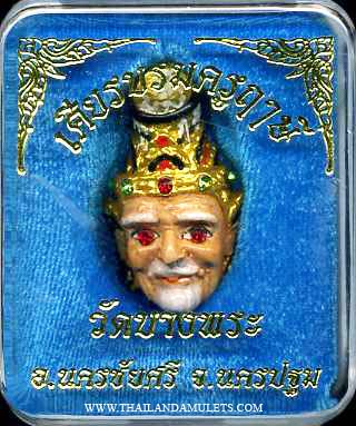 Beautiful art work, plated with gold, gem stone attached, top word "Wat Bangphra". Backside, top word "Luangpor Pern", gem stone attached, takrut craft with yant blessing mantra for protection attached, yant wrote for blessing good fortune.