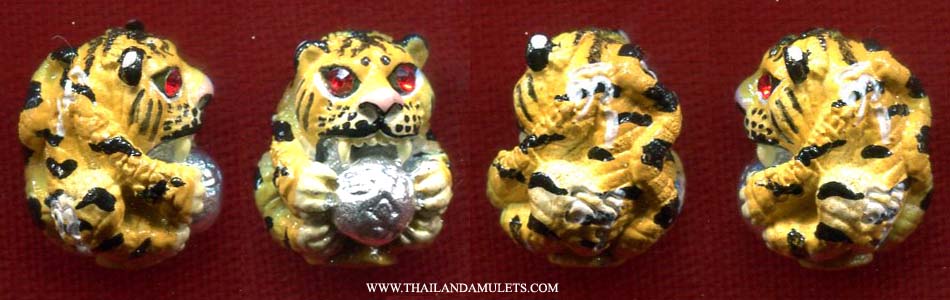 Tiger amulet batch "Bucha Kru"(Worship Masters/Elders) at WatBangphra b.e.2556(a.d.2013). Good designed, powerful blessing protection Tiger amulet. Image of Tiger holding gold/silver bag to welcome wealth fortune, filled/wrote with yans blessing mantras for protection, attached with gring holy bell inside for successful purpose. Good tiger amulet from WatBangphra.