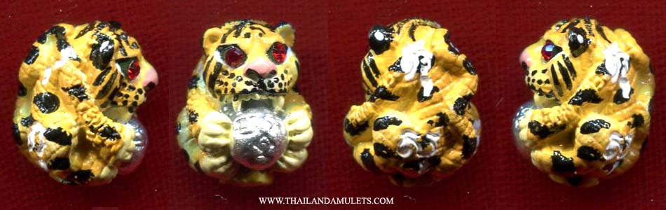 Tiger amulet batch "Bucha Kru"(Worship Masters/Elders) at WatBangphra b.e.2556(a.d.2013). Good designed, powerful blessing protection Tiger amulet. Image of Tiger holding gold/silver bag to welcome wealth fortune, filled/wrote with yans blessing mantras for protection, attached with gring holy bell inside for successful purpose. Good tiger amulet from WatBangphra.