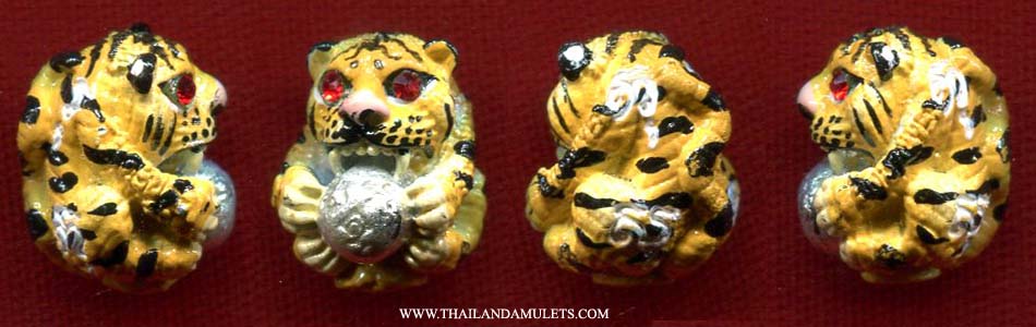 Tiger amulet batch "Bucha Kru"(Worship Masters/Elders) at WatBangphra b.e.2556(a.d.2013). Good designed, powerful blessing protection Tiger amulet. Image of Tiger holding gold/silver bag to welcome wealth fortune, filled/wrote with yans blessing mantras for protection, attached with gring holy bell inside for successful purpose. Good tiger amulet from WatBangphra.