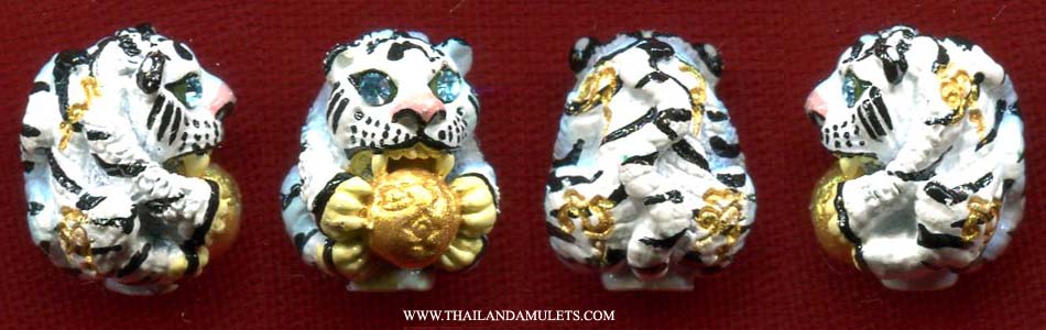 Tiger amulet batch "Bucha Kru"(Worship Masters/Elders) at WatBangphra b.e.2556(a.d.2013). Good designed, powerful blessing protection Tiger amulet. Image of Tiger holding gold/silver bag to welcome wealth fortune, filled/wrote with yans blessing mantras for protection, attached with gring holy bell inside for successful purpose. Good tiger amulet from WatBangphra.