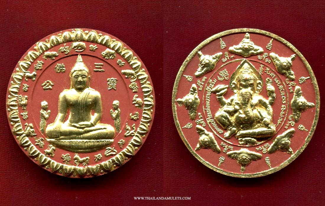 Red herb skin chanted by many monks visited from China, India and Tibet. The amulet image of Luangpor Toh the center buddha of Wat Phananchoeng circle with 12 chinese zodiac years. Back side PhraPikaned god of art and wealth circle with PhraRarhu giant god of protection, the amulet plated with gold. The amulets bring successful in business fortune and protection against bad luck misfortune.